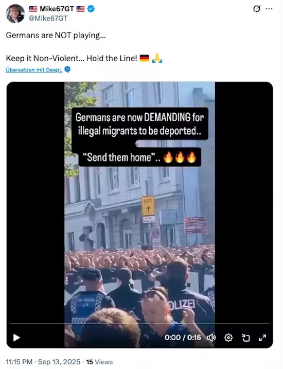 Die Behauptung, dass auch in Deutschland Tausende Menschen gegen Migration auf die Straße gehen, wird durch ein viral gegangenes Video untermauert. Darin ist eine große Gruppe schwarz gekleideter, skandierender Menschen zu sehen.