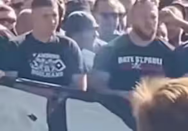 Was im Internet als politische Kundgebung dargestellt wird, ist in Wirklichkeit ein Fanmarsch des Hamburger Fußballclubs HSV. Das Video entstand am 29. August anlässlich des Stadtderbys gegen den Lokalrivalen FC St. Pauli. Erkennbare Aufschriften wie „Hamburg“ und „Polizei Kommunikationsteam“ sowie die Umgebung in der Max-Brauer-Allee bestätigen den Zusammenhang. Auch die Rufe der Menge sind keine politischen Slogans, sondern ein Fangesang gegen den gegnerischen Verein.