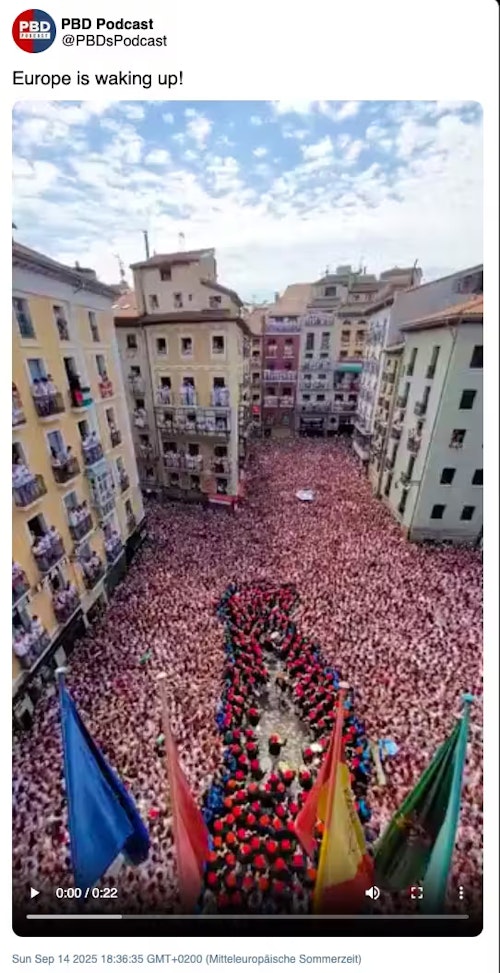 Ein dritter viraler Clip, der angeblich zeigt, wie „Europa aufwacht“, zeigt einen dicht gefüllten Platz mit Hunderttausenden Menschen.