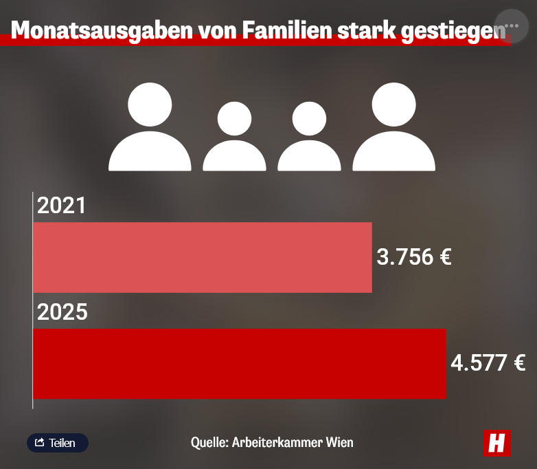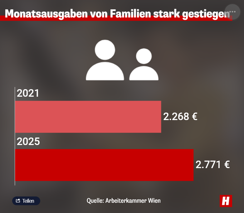 Ein konkretes Beispiel verdeutlicht die Brisanz: Eine vierköpfige Familie mit zwei Elternteilen und zwei Kindern (im Alter von 7 und 14 Jahren) brauchte 2021 noch 3.756 Euro monatlich. Heute, nur vier Jahre später, sind es bereits 4.577 Euro. Das ist ein Anstieg von 821 Euro oder 22 Prozent. Aufs Jahr gerechnet ergibt das 9.852 Euro Mehrkosten.