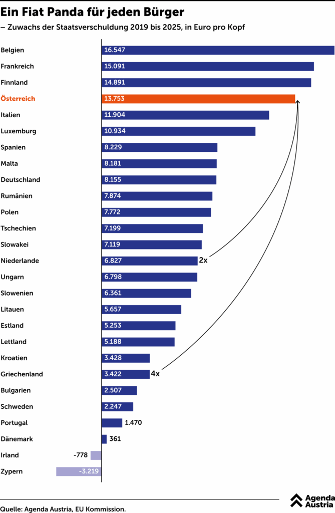 Besonders alarmierend ist die Entwicklung der Staatsschulden. Seit 2019 sind die Schulden pro Kopf um fast 14.000 Euro gestiegen. Eine Analyse der Agenda Austria macht die Dimension dieser Entwicklung deutlich: Das ist doppelt so viel wie in den Niederlanden und sogar viermal mehr als in Griechenland, einem Land, das lange als Synonym für die Schuldenkrise stand.