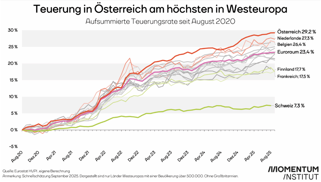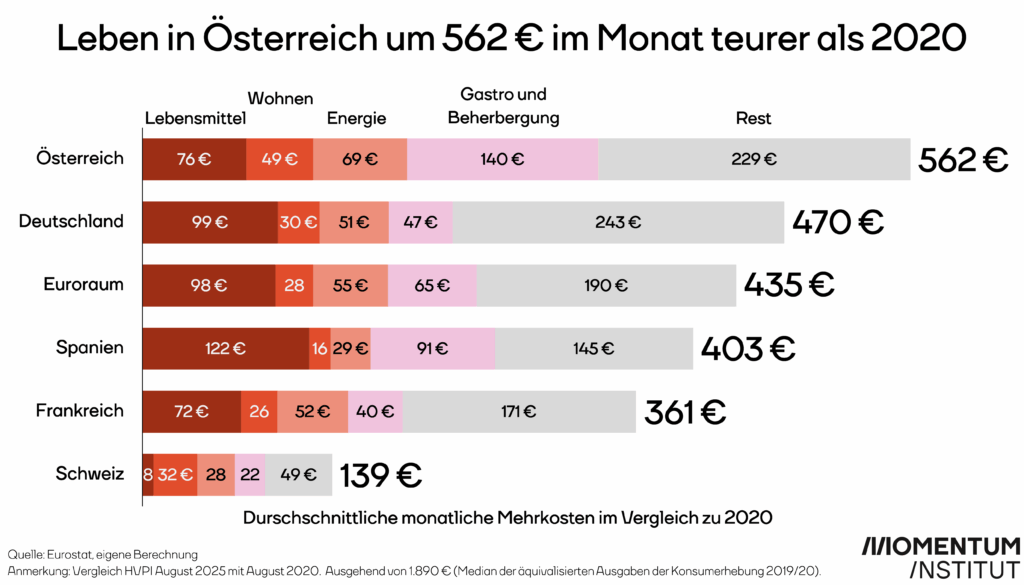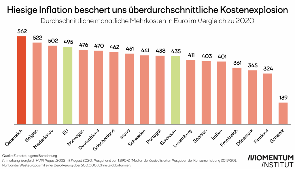 Wien/Linz/Graz. Die finanzielle Belastung für die Bürger in Österreich hat seit 2020 ein beispielloses Ausmaß angenommen. Im August 2025 müssen österreichische Haushalte im Durchschnitt 562 Euro mehr pro Monat aufbringen, um denselben Lebensstandard zu halten wie noch vor fünf Jahren. Das ergibt eine jährliche Mehrbelastung von 6.744 Euro. Damit ist Österreich – das zeigt eine aktuelle Analyse des Momentum Instituts – die Inflationshochburg in Westeuropa.